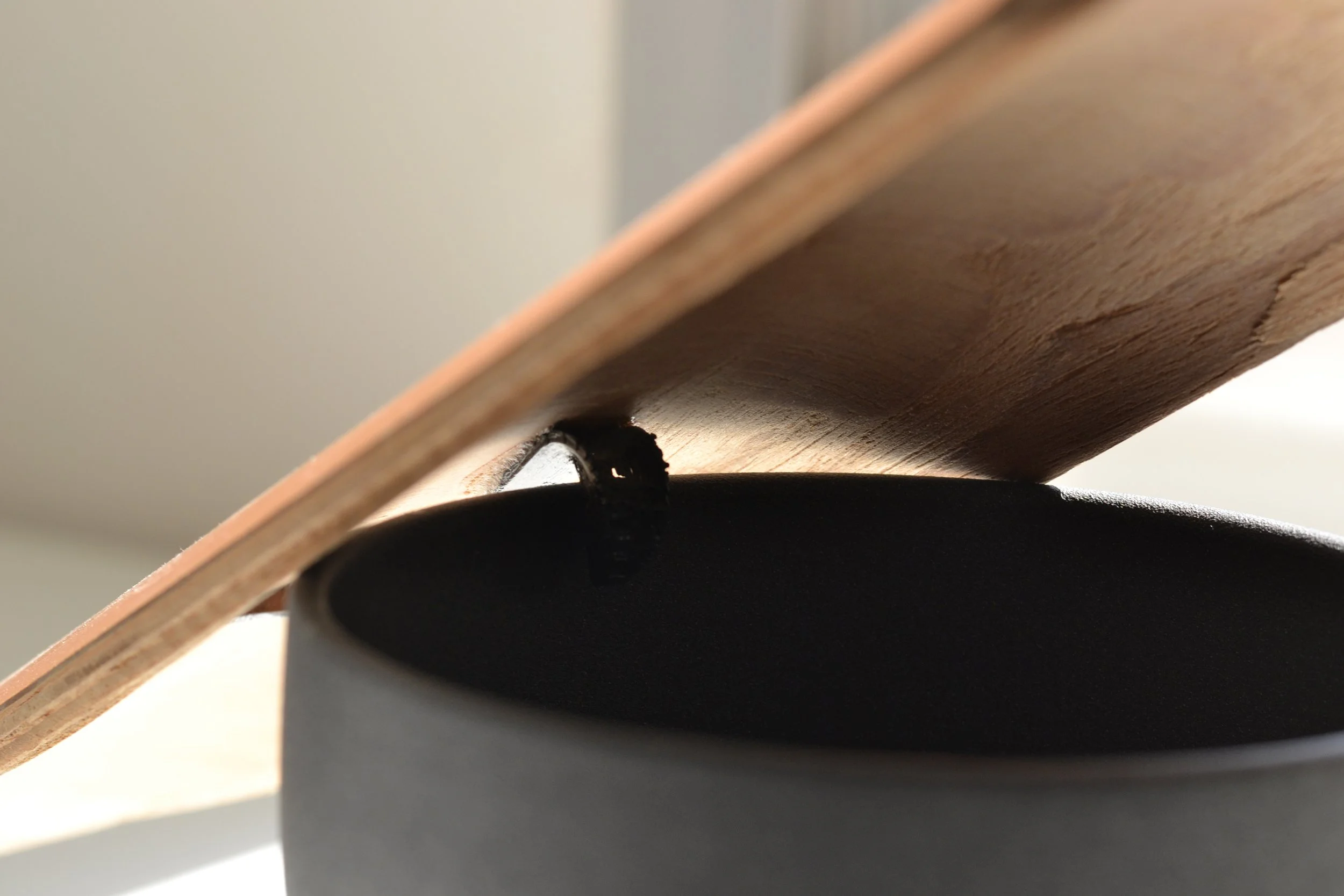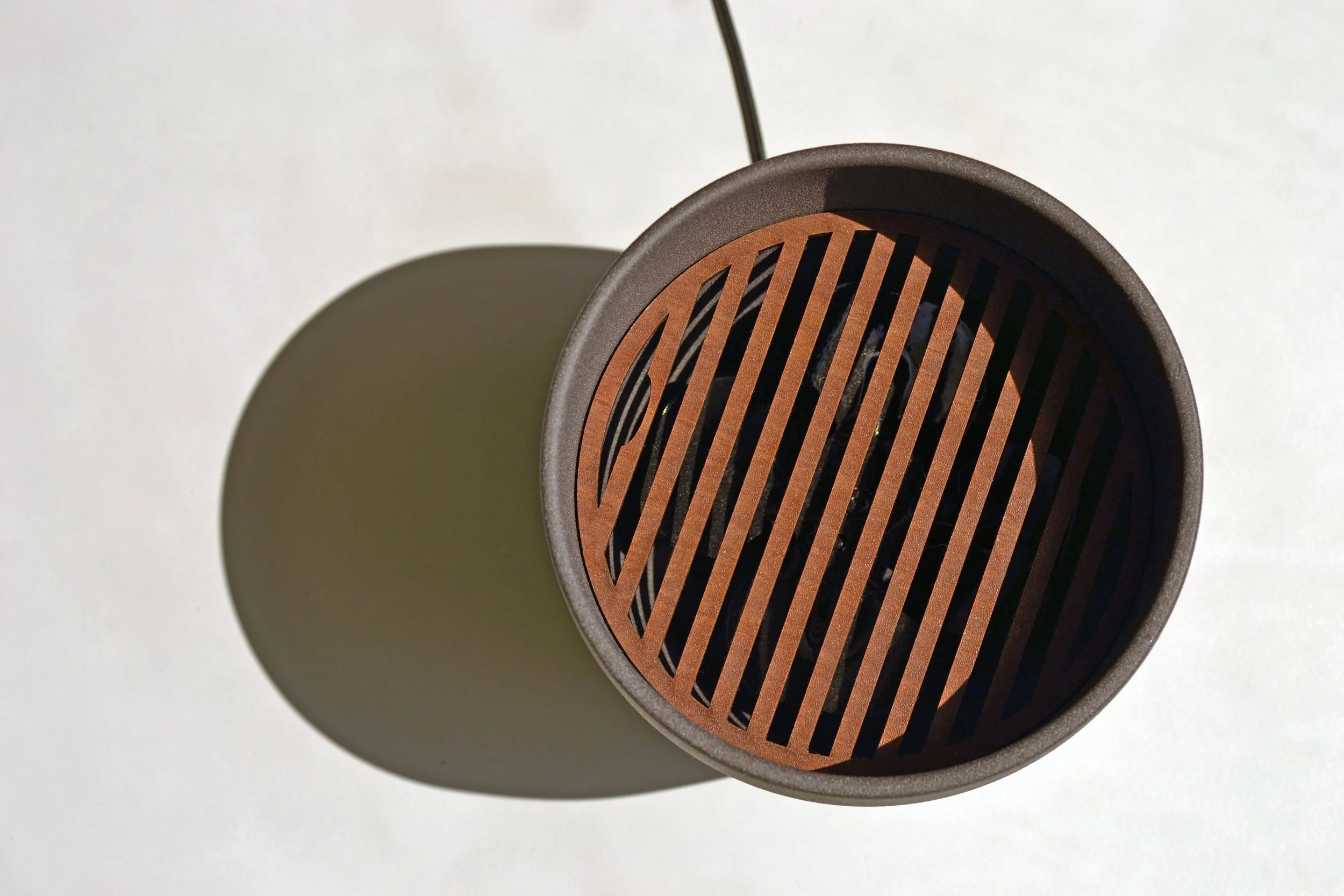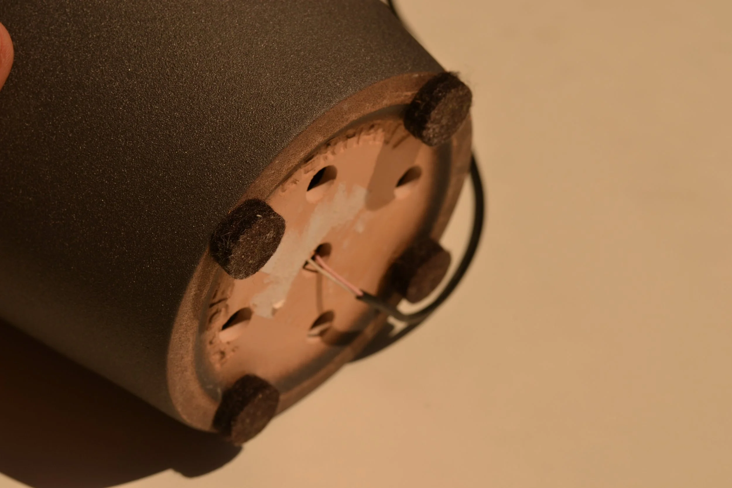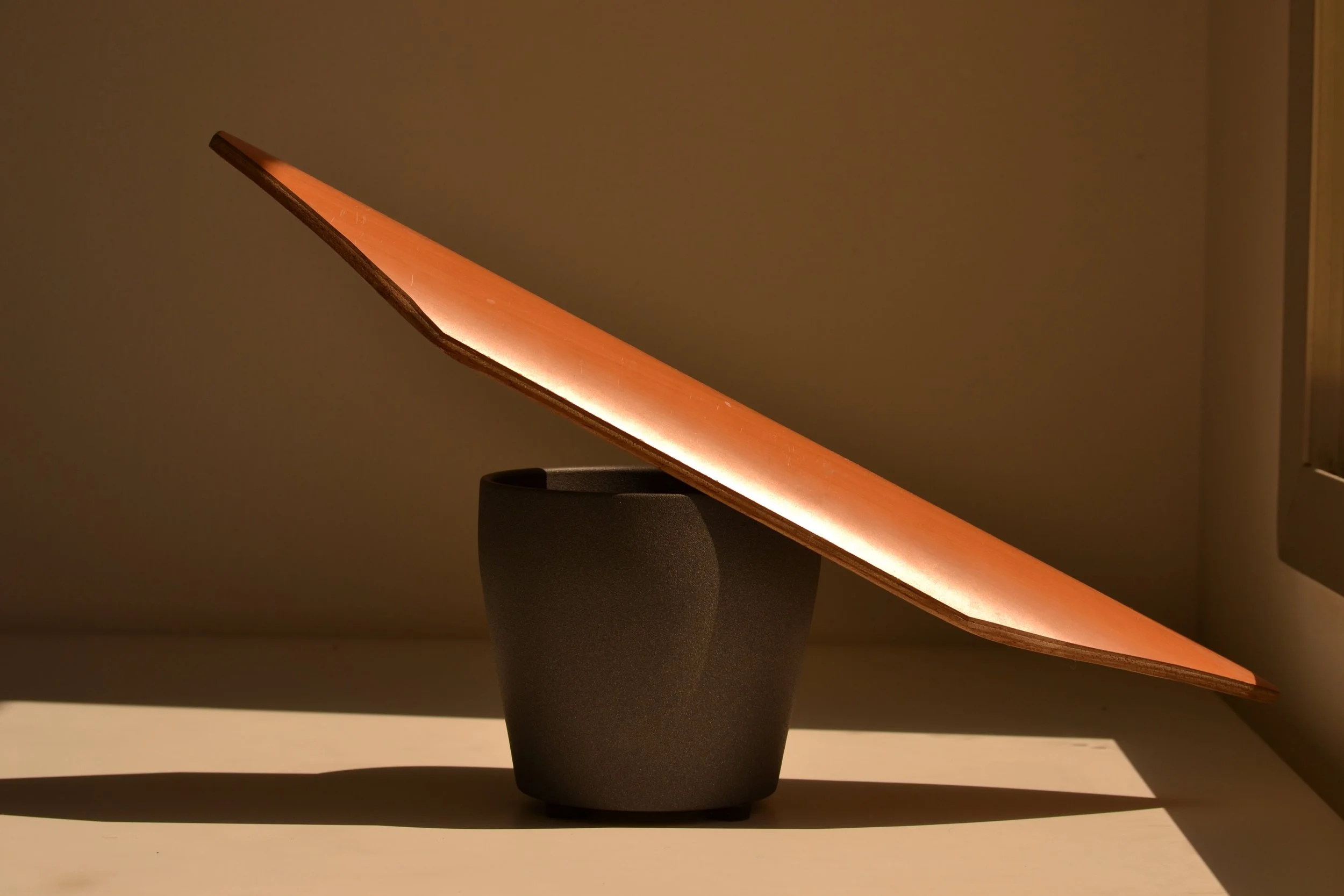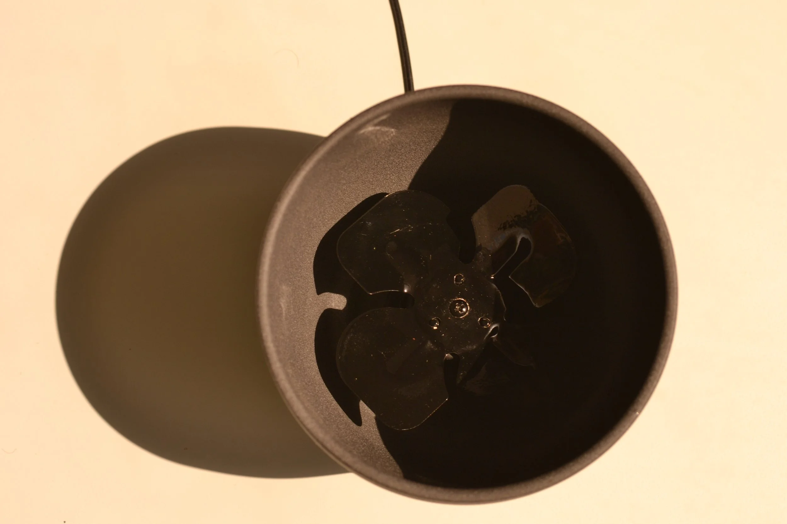 The base of the fan, representing the olive, was a recycled IKEA pot. Inside of the fan I used and repainted an old fan. The upper ‘leaf’ part, representing reused olive wood, redirects the air towards the user. Foam pads added on the bottom to provide airflow from holes drilled into the IKEA pot. While a small 3D printed hook was created to match the curve of the leaf.